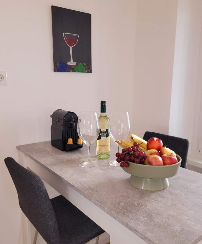 In der Küche sind Geschirrspüler, E-Herd, Backrohr, Kühlschrank und sonstige Grundausstattung zur Selbstversorgung vorhanden. Im Barbereich können Sie einen Snack oder hervorragenden Wein aus dem Burgenland genießen.
