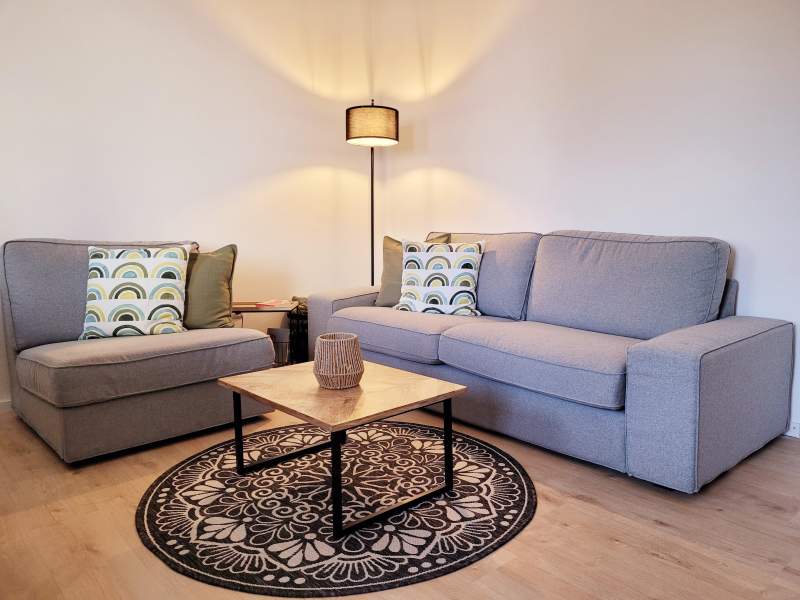 Im modern gestalteten Wohnbereich können Sie auf der gemütlichen Couch und den bequemen Sesseln gemeinsamen Verweilen (z.B. beim Fernsehen via Sky TV). Der große Esstisch bietet Platz für bis zu sechs Personen. Für Familien oder Gruppen können die Sitzgelegenheiten zu gemütlichen Betten für bis zu vier Personen umgestaltet werden.