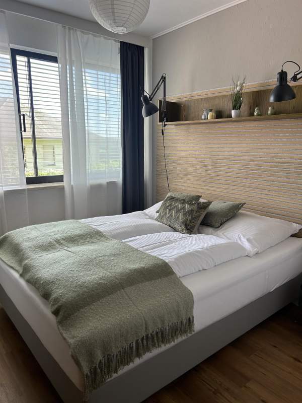 In den zwei kleinen Schlafzimmern befinden sich Betten mit den Maßen 160×200 cm, in den großen, etwas geräumigeren Schlafzimmern, mit den Maßen 200×200 cm.
