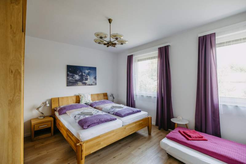 - Schlafzimmer 3 mit Doppelbett (180x200 cm Liegefläche), Ausziehsofa (Liegefläche 100x190 cm) und großem Kasten (Gitterbett möglich) sowie angeschlossenem Badezimmer.