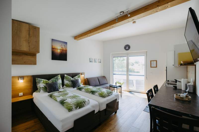 Zwei NEUE und voll ausgestattete Appartements (für 1-4 Personen pro Appartement) (Gesamt bis zu 7 Personen) in ruhiger Lage am Stadtrand, direkt am Radweg nach Oggau - Balkon mit traumhaftem Blick in die Weingärten - Parkplatz und Ladestation für Elektroautos/Elektrofahrräder vorhanden!