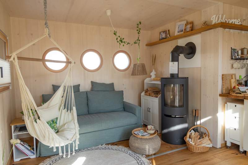 Auf meinen 26m² ist viel Platz zum gemütlichen Abhängen. Im Wohnbereich befindet sich eine Couch, die ganz einfach zu einem 2. Bett umfunktioniert werden kann, ein Hängesessel und mein wunderbarer Holz-Pellets-Ofen für die besondere Atmosphäre im Winter. Der Schlafbereich ist durch meinen Kasten optisch abgetrennt und bildet somit eine gemütliche Nische. Durch das große Bullaugen-Fenster fällt der erste Blick am Morgen direkt ins Grüne. Meine gut ausgestattete Küche bietet ein Induktions-Kochfeld, einen Kühlschrank, Küchenutensilien, Tee- und Kaffeezubehör. Im separaten Badezimmer gibt's eine riesige Dusche, eine Bio-Trenntoilette aus Holz und ein besonderes Waschbecken aus Naturstein. Meine riesige Terrasse lädt zum Entspannen ein und abends lässt man den Tag am besten bei der Feuerstelle ausklingen.