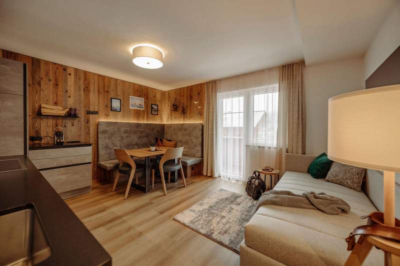 Komfortables Einraum-Studio mit hochwertiger Küche, gemütlicher Sitzecke, Massivholzbetten, einem Badezimmer mit Dusche und WC sowie eigenem Balkon mit Blick auf das Grießenkareck und der „Hermann Maier – Weltcup Strecke“. 2-3 Personen, 30m2