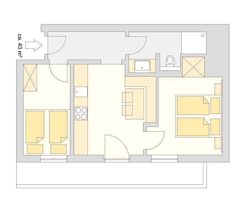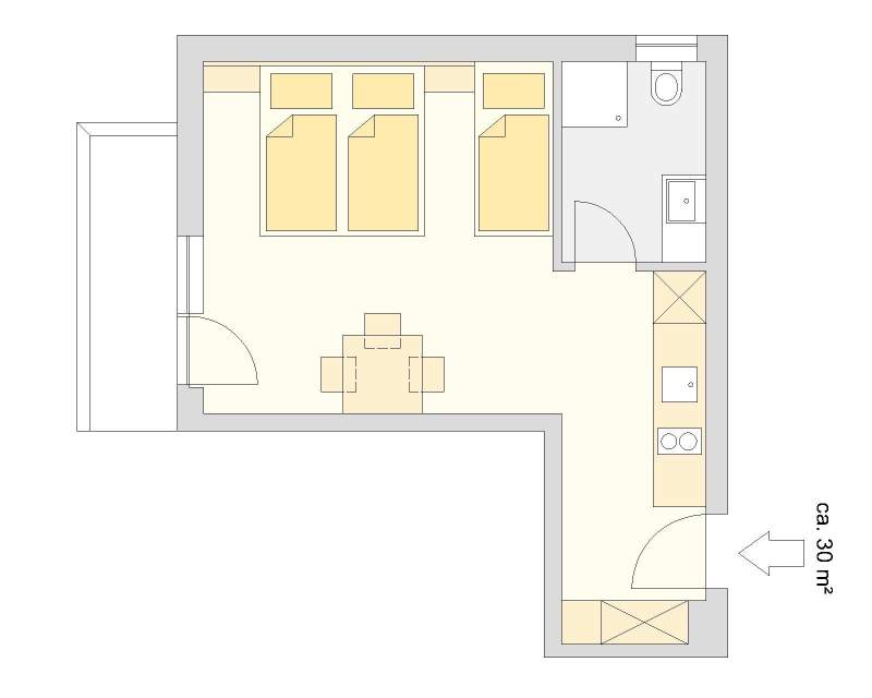 Appartement mit einer Wohn-/Schlafküche inkl. Sitzecke und hochwertig ausgestatteter Küche, einem separaten Schlafzimmer für drei Personen, einem Badezimmer mit Dusche, einem separatem WC sowie einem eigenen Balkon mit Aussicht auf die Bergwelt.