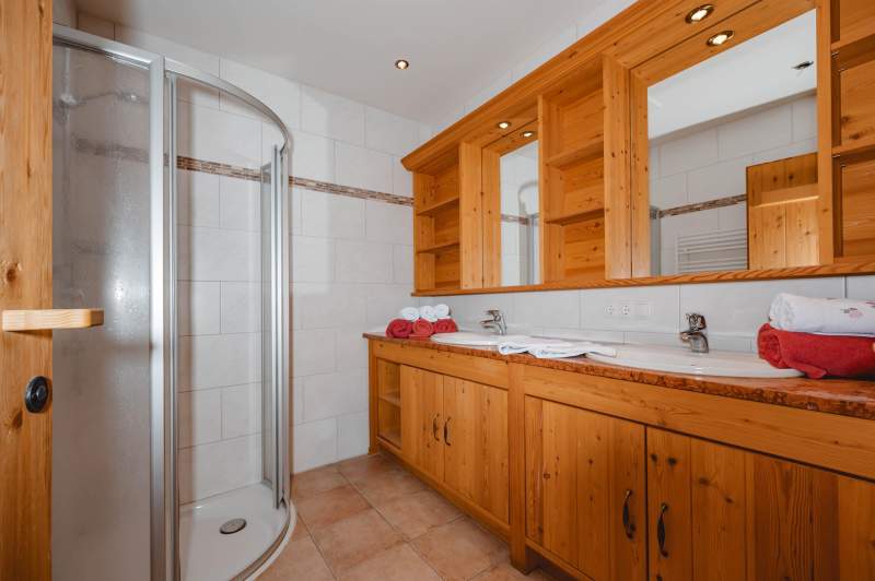 Das hochwertig ausgestattete Bad mit Dusche, Doppelwaschtisch und separatem WC wird durch rustikale Holzelemente aufgelockert und verleiht ein ländliches Flair.
