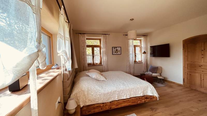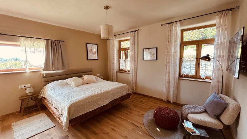 Es ist mit seinen großzügigen 52m² das größte der drei Gästezimmer. Sie schlafen in einem gemütlichen Bett, das aus alten Dachbalken gefertigt wurde und somit einzigartig ist.