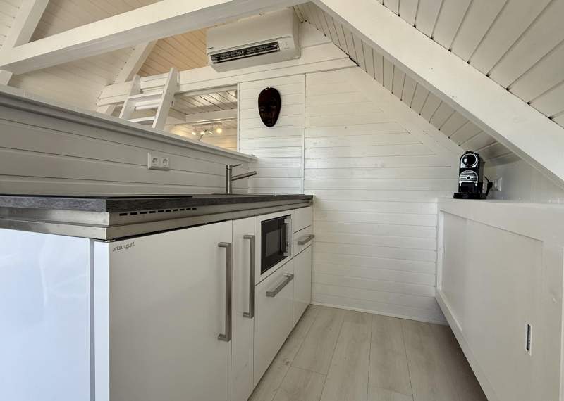 Im Zentrum steht das hochwertige Luxus Boxspringbett samt Serta-Matratze, das Schlafkomfort auf 5-Sterne-Niveau bietet. Ein zweites, romantisch unter dem Dach gelegenes großes Doppelbett (180 × 200 cm), erreichbar über eine Leiter, lädt zum Träumen ein – mit Blick in den offenen Dachgiebel und dem leisen Schilfrauschen als Hintergrundmusik. Bitte beachten Sie: Der obere Schlafbereich ist nicht für Gäste mit eingeschränkter Beweglichkeit geeignet – dafür ein umso besonderer Ort für alle, die mit Herz und Leichtigkeit reisen.