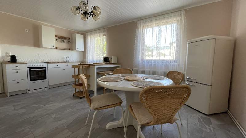 Das Appartement AVA 1 verfügt über eine komplett ausgestattete Küche mit einem Backofen, Herd, Heißluftfritteuse, Mikrowelle, Geschirrspüler, volles Sortiment an Utensilien, Geschirr und Besteck. Ein Esstisch für 4 Personen befindet sich in der Küche.