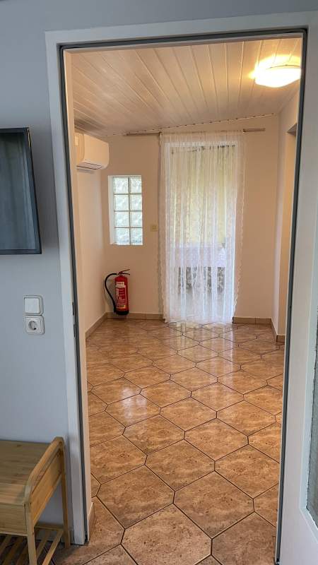 Das Appartement AVA 1 wurde ebenfalls 2023 komplett renoviert. Es handelt sich um eine 60m2 Wohnung im ersten Stock des Hauptgebäudes. Die Wohnung ist für 4 Personen gedacht und besteht aus zwei großzügigen Schlafzimmern, einer Wohnküche, einem kleinen Eingangsbereich und einem Bad mit WC. Die Räumlichkeiten sind modern und sauber ausgestattet und beide Schlafräume sind mit einer Klimaanlage versehen. Beide Schlafräume haben eine eigene Terrasse mit seitlichem Seeblick.
