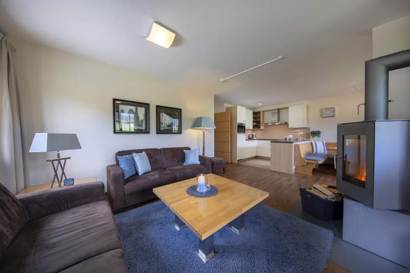 Die luxuriöse Ferienwohnung B1 für 2 - 6 Personen verfügt über 3 Schlafzimmer mit Doppelbetten sowie 2 Badezimmer. Der Kaminofen im Wohnzimmer sowie die große ebenerdige Terrasse mit herrlichem Berg-Panorama laden zum Genießen ein. Die Wohnung verfügt über eine vollausgestattete moderne Wohnküche sowie einen Kabel-TV und Streaming-Dienste und gratis W-Lan.
